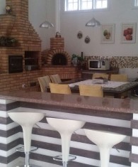 Espaço gourmet com churrasqueira, forno e forno de pizza